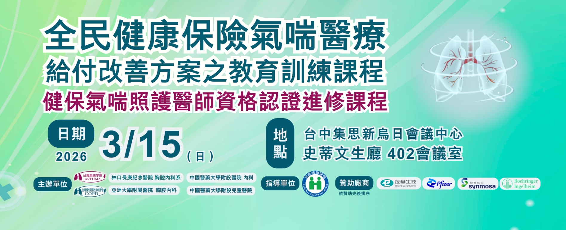 2026/3/15(日)中區- 全民健康保險『氣喘』醫療給付改善方案之教育訓練課程-『健保氣喘照護醫師資格認證進修課程』-資深、教授級講師領航,連結國際新知,深化臨床實務